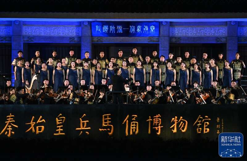 ↑在国际博物馆日“奇迹之夜”音乐会上,西安交响乐团合唱团在秦兵马俑一号坑遗址前演唱(2019年5月18日摄)。新华社记者 李一博 摄