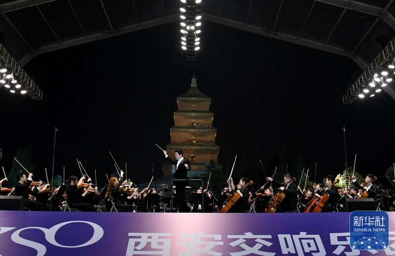 ↑西安交响乐团在西安大雁塔北广场户外公演(2020年9月19日摄)。新华社记者 李一博 摄