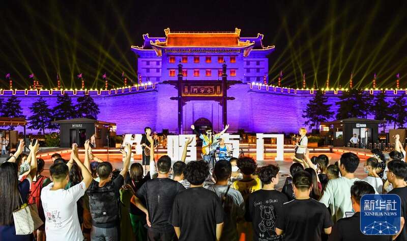 ↑游客在西安城墙永宁门广场欣赏乐队演出(2022年8月1日摄)。新华社发(邹竞一 摄)