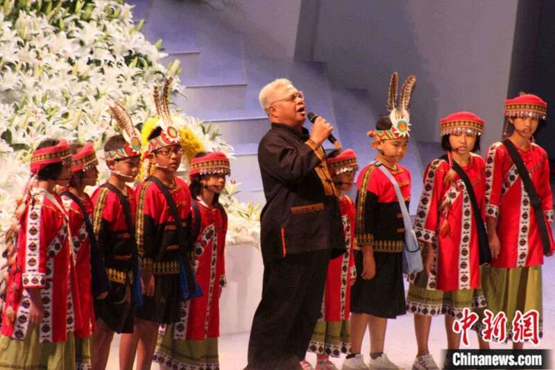 2009年9月,“88水灾”追悼大会在高雄市巨蛋举行,约5000人与会。图为台湾著名歌手胡德夫带领九个孩子出场,演唱歌曲悼念逝者,为受灾民众祈福。董会峰 摄