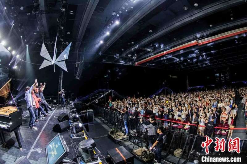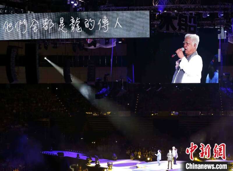 2015年6月,“民歌40:再唱一段思想起”演唱会在台北小巨蛋举行。包括齐豫、李宗盛、潘越云在内的几十位知名歌手齐聚一堂,共同纪念台湾民歌运动兴起40周年。图为胡德夫等人合唱《龙的传人》。郑巧 摄