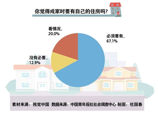 调查中,67.1%的受访青年明确,成家时必须要有自己的住房,12.9%的受访青年表示没有必要,20.0%的受访青年认为要看情况。