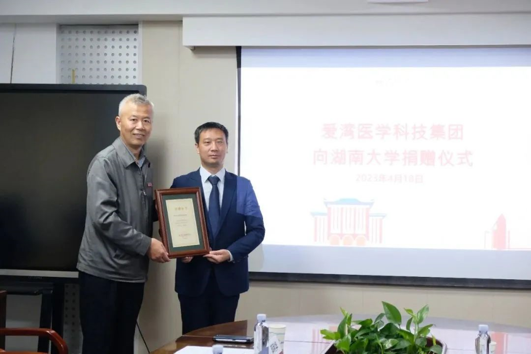 湖南大学教育基金会理事长陈伟(左)向杨江涛(右)颁发捐赠证书。