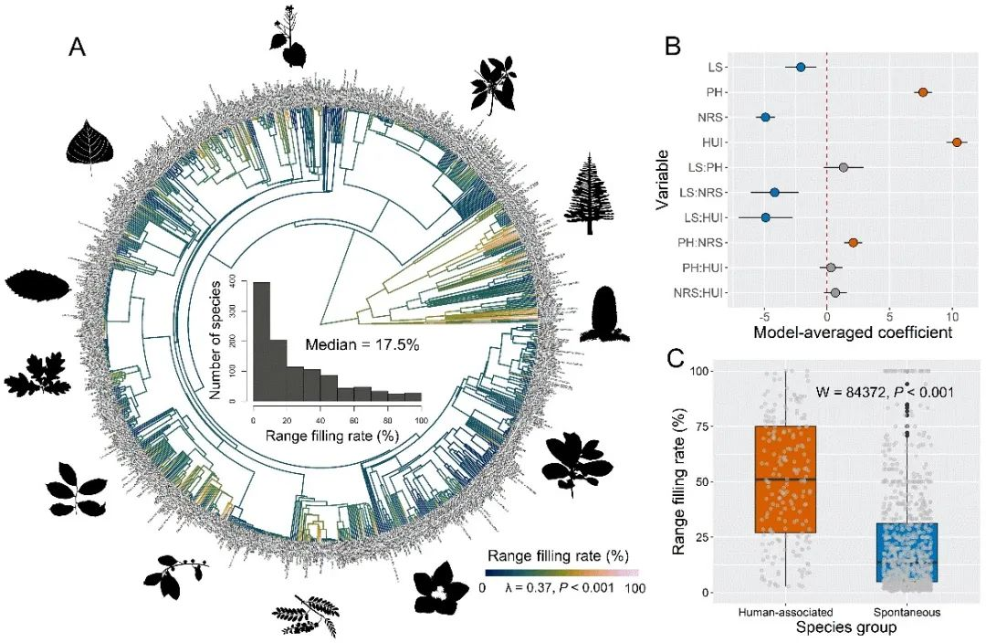 物种分布占有率(RFR)的种间差异和影响因素。A,基于物种分布占有率的系统发育信号;B,物种分布占有率的影响因素;C,人类关联种和自生种物种分布占有率比较。