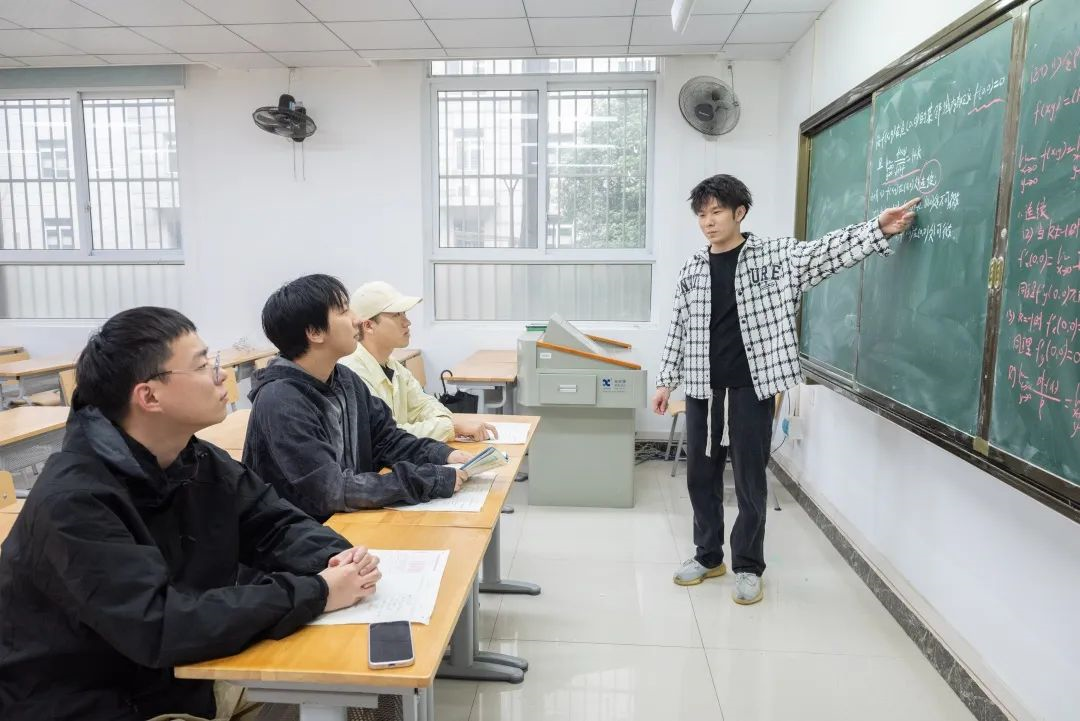 教室里,一人拿着粉笔对着黑板讲解,寝室剩余三人坐在讲台下听讲。