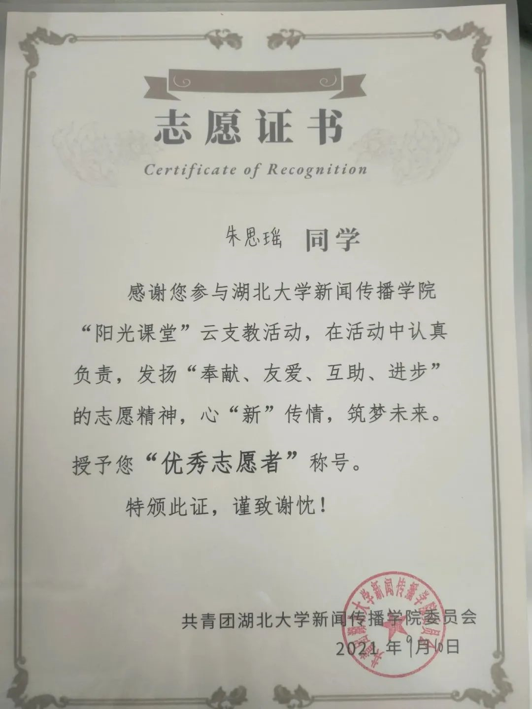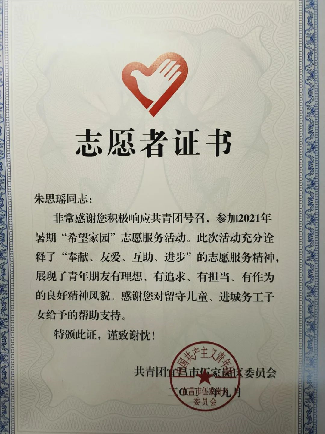 “我们不能总在忙于课业,还要给自己一些喘息的空间。”朱思瑶笑着说,“好像我的志愿活动大多是和孩子们有关的。”提及孩子,她的眼睛弯成了月牙状,“在活动中感受到孩子们的真诚和善意,这是难能可贵的。”