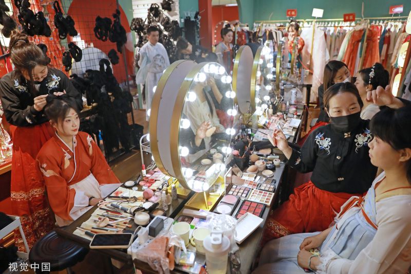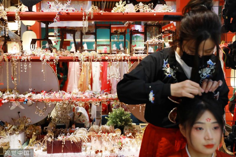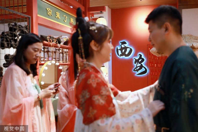 近年来,“沉浸式旅游”逐渐成为旅游新风尚。其中,“汉服体验”是最热门的游玩方式之一。西安大唐不夜城的工作人员介绍,随着文旅市场的强势复苏,2023年以来街区体验唐装汉服的游客明显增多,地处西安大唐不夜城中段的壹洋堂购物中心 ,商场里近七成的商铺打造成了汉服体验馆,从汉服租赁、妆造服务到汉服跟拍,这条产业链上的每个人密切合作,帮现代人进入盛唐时光。