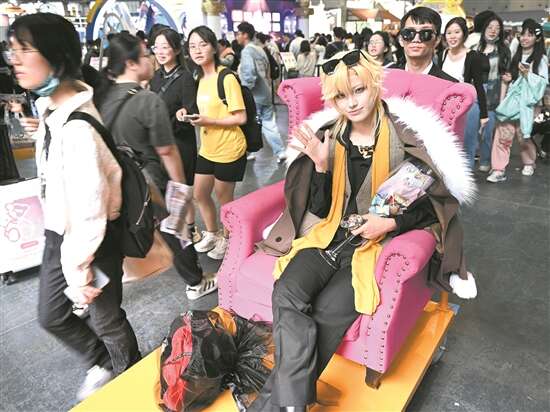 上海Comicup动漫上,坐在沙发上被推着走的“时空中的绘旅人”扮演者 图/视觉中国