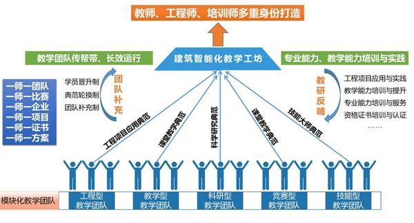 建筑智能化工程技术专业群以教学能力比赛为契机,构建以模块化教学团队为支撑、建筑智能化教学工坊为典范的“模-坊”式师资队伍培养机制。在“模-坊”式师资队伍培养机制下,培养教学创新团队2个、黄大年式教师团队1个;团队连续5年获重庆市教学能力比赛土建类一等奖,国家级二等奖2项、国家级一等奖1项,获奖等级和数量居重庆市土木建筑类首位。