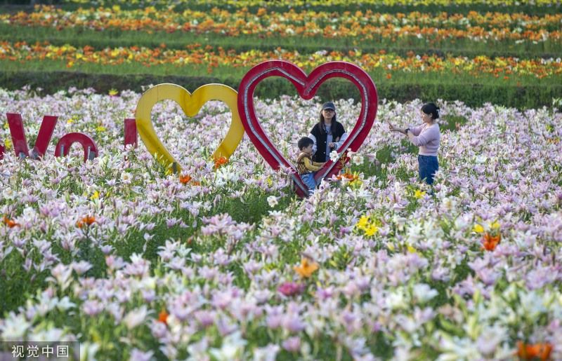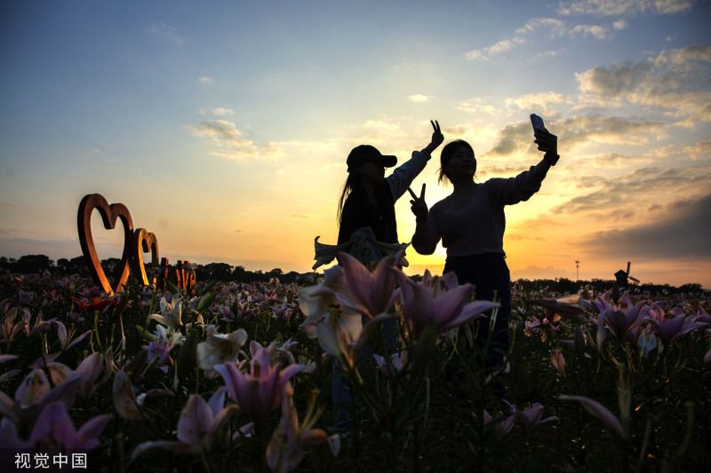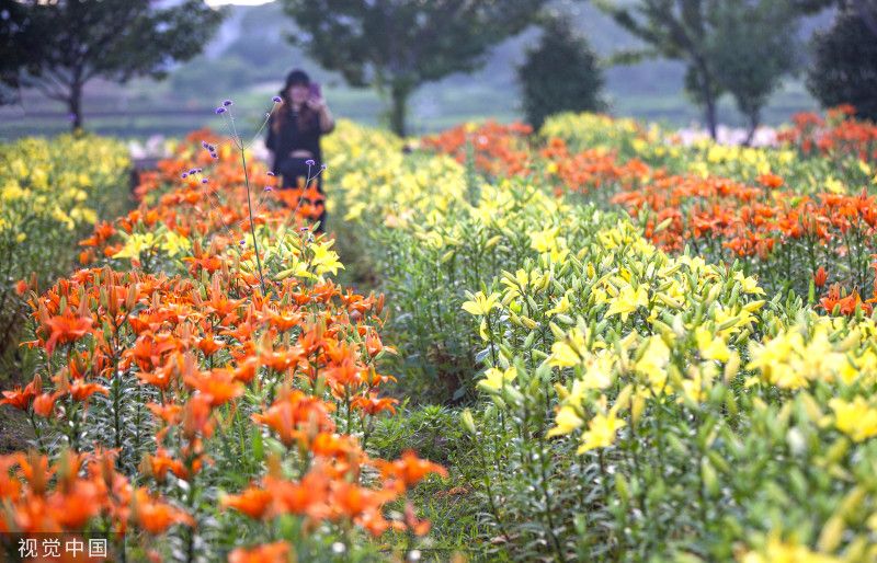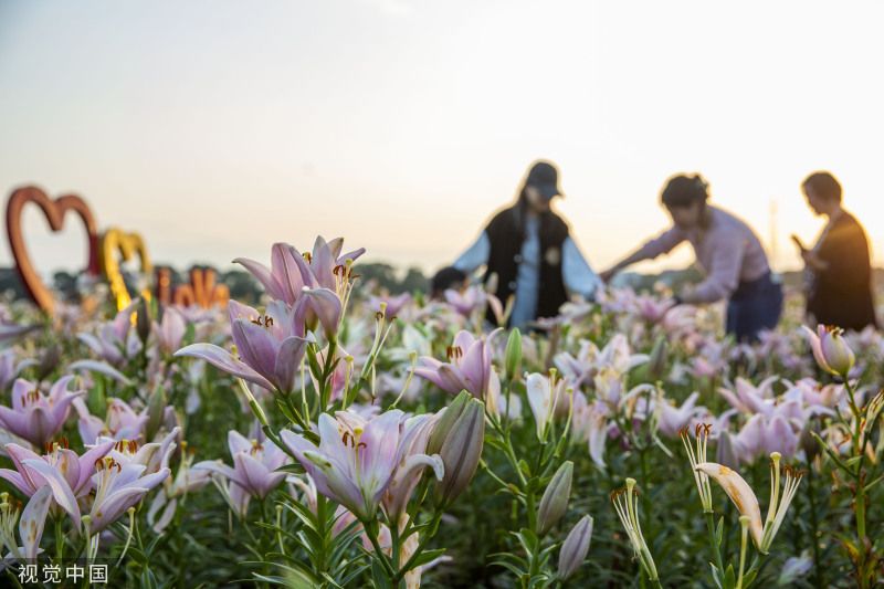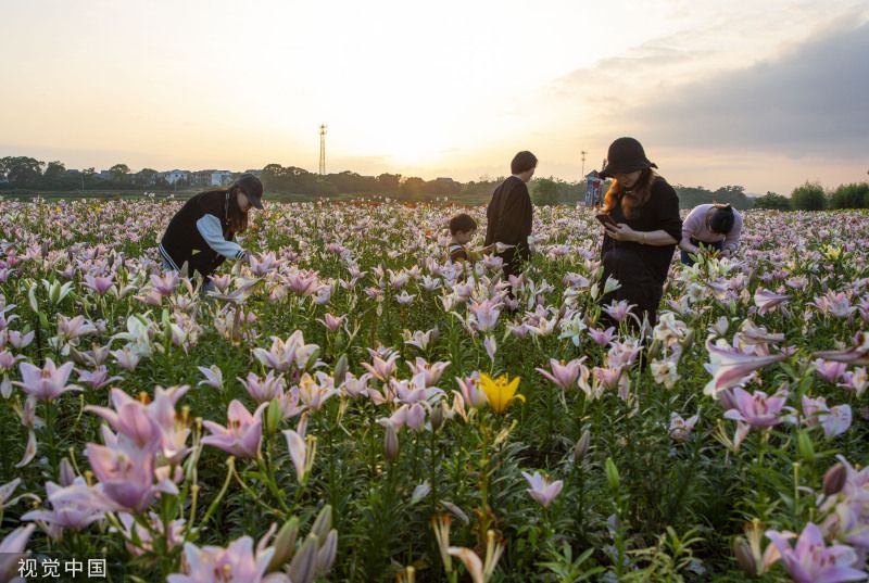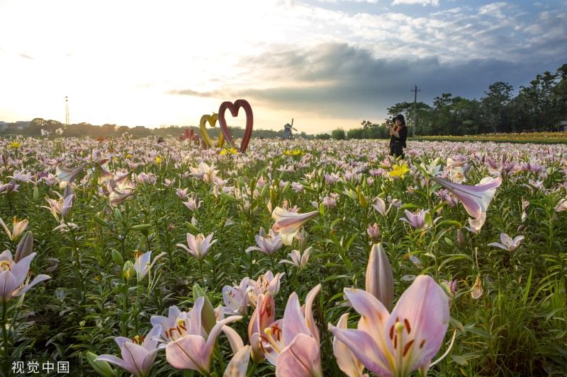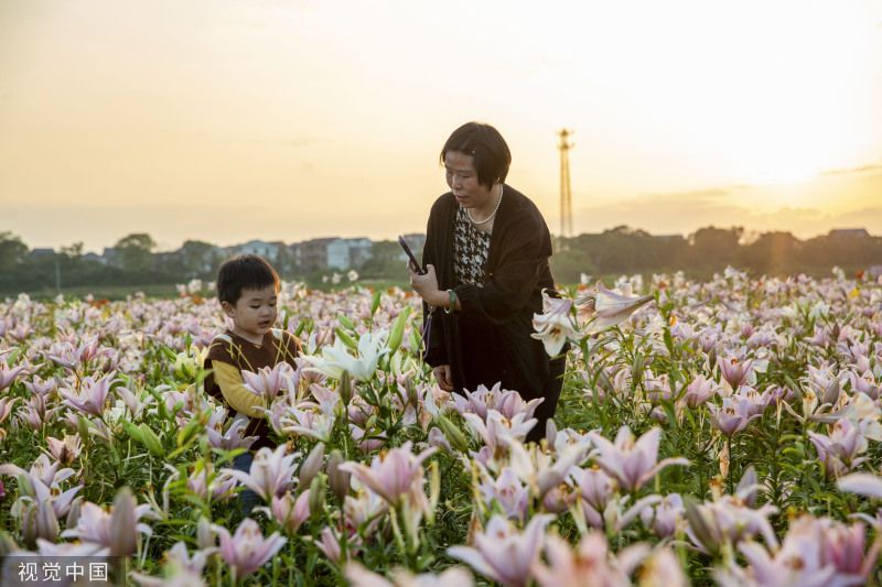 2023年5月24日,江西九江,都昌县南峰镇鄱湖百合园的百合花盛开,游客前来赏花拍照。