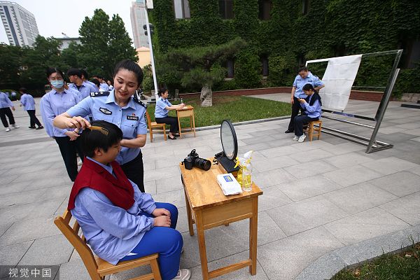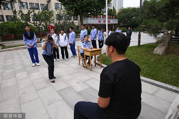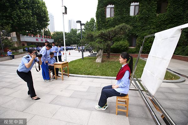 2023年5月26日,济南公安局市中区分局治安大队与杆石桥派出所民警来到山东省实验中学为高考生拍照办理身份证。