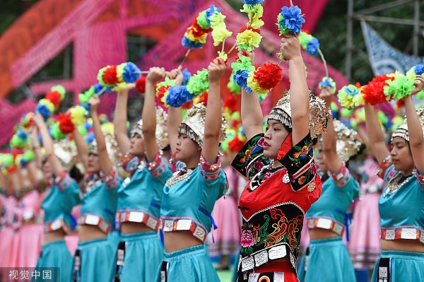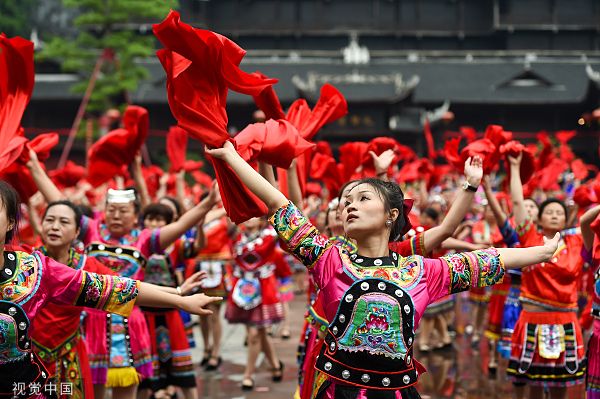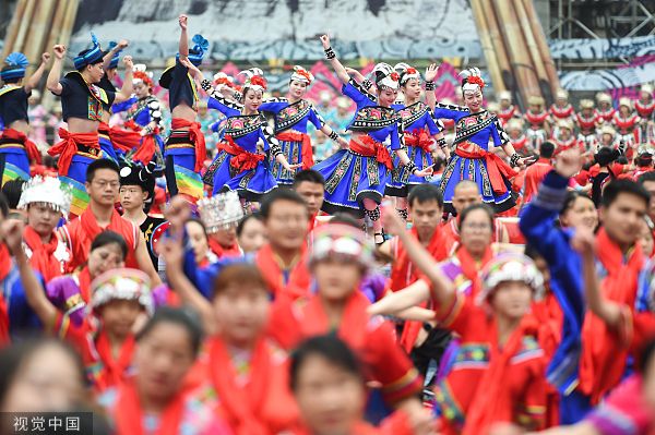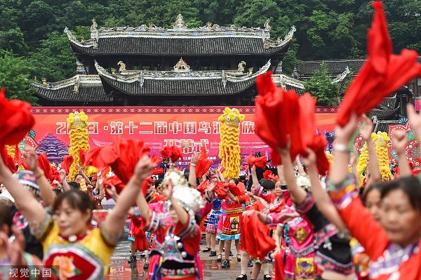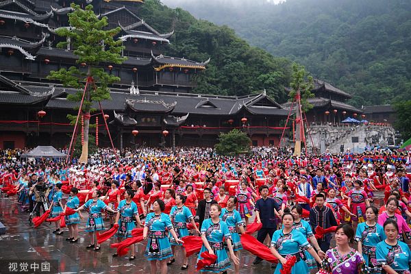 2023年5月26日,重庆彭水,苗乡儿女载歌载舞欢度踩花山节。当日,2023·第十二届中国乌江苗族踩花山节在重庆彭水苗族土家族自治县蚩尤九黎城开幕,万余名身着盛装的苗乡儿女载歌载舞,欢庆苗族传统节日。据悉,彭水是重庆市唯一以苗族为主、全国苗族人口聚居最多的少数民族自治县,是重庆的苗乡、中国的苗乡、世界的苗乡。 中新社记者 何蓬磊 摄
