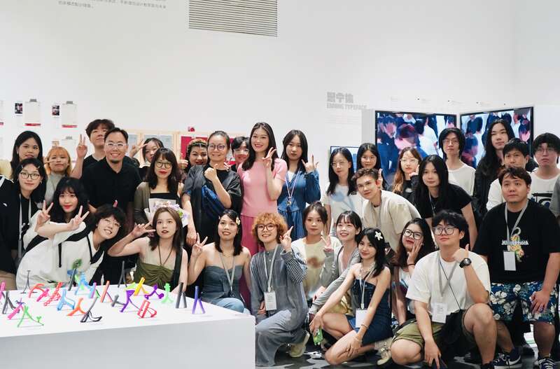 广州美术学院毕业作品展现场师生合影。文心妍/摄