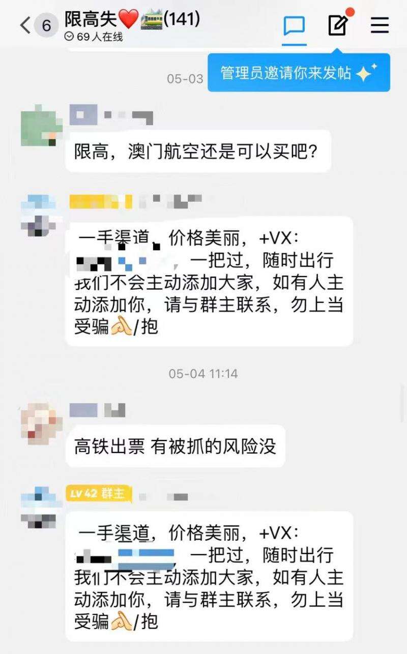 在该QQ群,有人咨询“美国能飞吗”,群主回复“联系群主出行”。还有多人询问“能否购买高铁票?”“高铁出票有没有被抓的风险?”“限高(限制高消费),澳门航空还是可以买吧?”“购票成功怎么登机?”还有人询问,能否用护照自己购票,有群成员表示,试过用护照买机票和高铁票,都不行。