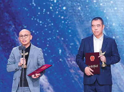 第十九届中国电影华表奖优秀导演奖获得者代表林超贤(左)、陈凯歌发表获奖感言。