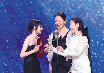 倪萍(中)、惠英红(右)为获得第十九届中国电影华表奖优秀女演员奖的张子枫颁奖。