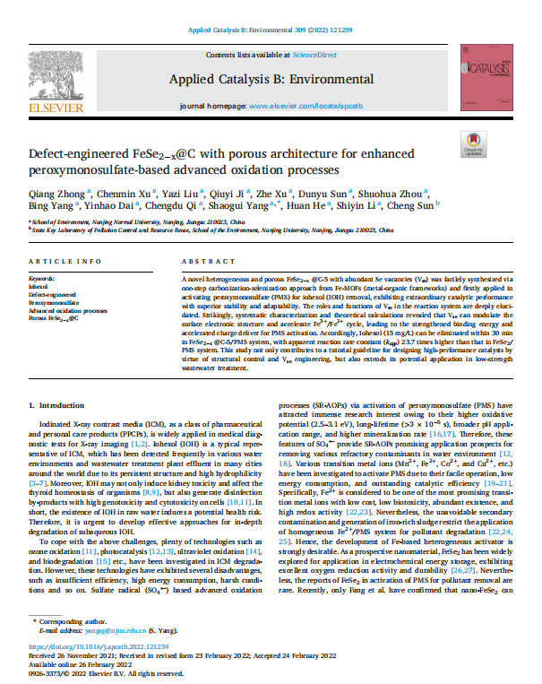 他调研了大量有关活化过硫酸盐高级氧化的文章,发现活性自由基在有机污染物的高效去除方面具有独特优势,且基于过硫酸盐的高级氧化体系关键在于制备廉价、稳定和高效的非均相催化剂。此外铁硒化物作为铁基材料的一种,它能够活化PMS降解污染物,但是对污染物去除效率仍不尽人意。