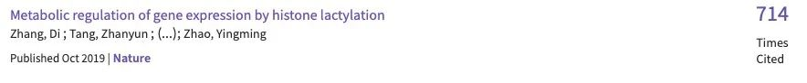 近年来,张迪在专业领域内所取得的一系列成果发表在Nature、Nature Genetics、Molecular Cell、Science Advances、Nature Communications、Nature Reviews Molecular Cell Biology等重要的学术期刊上。其中在2019年,张迪作为第一作者身份在Nature上发表的论文“Metabolic regulation of gene expression by histone lactylation”至今已被Web of Science引用700余次。