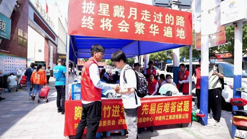 “作为央企青年,也是一名曾经参加过高考的过来人,我很高兴能有这样的机会与团县委和县志愿中心的志愿者一起为考生服务,也让我们感受到自身价值所在。”30岁的安监部经理的江登峰说。(活动图片为中建科工、团肥西县委提供)