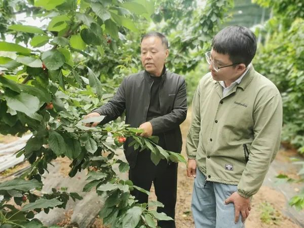 5月10日,在位于陕西省渭南市合阳县金峪镇方寨社区的樱桃园里,我校派驻合阳第10批研究生助力团成员侯宇翔正与社区党总支书记陈银榜一起查看樱桃生长情况。“再过几天,方寨樱桃就要集中上市。最近我每天都要过来看看,心里才会踏实些。”侯宇翔说。