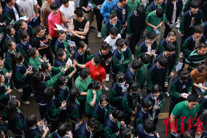 6月7日,浙江诸暨,诸暨职教中心考点,中职考生们进考场前与老师击掌。浙江2023年高考于6月7日-10日举行,其中,单独考试招生文化考试于7日进行,考试时间为一天,科目为语文、数学,参加考试的是当地中职学校的考生。在当天的文化考试之前,中职考生们已经于半年内完成了职业技能、职业理论考试,职教高考进入最后的关头。中青报·中青网记者 曲俊燕/摄