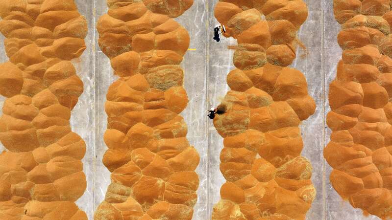 6月9日,江苏省淮安市淮安区白马湖农场工人在晾晒小麦(无人机照片)。眼下正值小麦集中收获时节,各地农民抢抓晴好天气忙着收割、晾晒小麦,确保小麦颗粒归仓。新华社发(陈凯/摄)