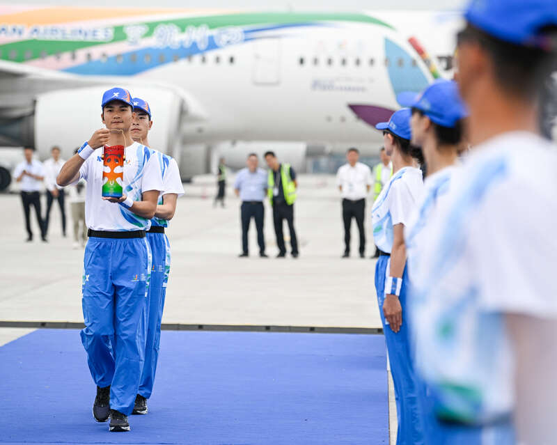 6月8日,在成都天府国际机场,护卫队队员护送成都大运会火种灯准备登机。当日,第31届世界大学生夏季运动会火炬传递启航仪式在成都天府国际机场举行。据悉,6月10日,成都大运会火炬传递活动将在北京启动。接下来,火炬将在北京、哈尔滨、深圳、重庆、宜宾五座城市传递。之后,火炬将回到成都传递。成都大运会主火炬塔将于7月28日被点燃。新华社记者 王曦/摄