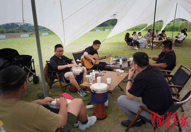 6月5日,浙江省湖州市安吉县天荒坪镇余村村,“余村印象”青年图书馆外,一个安吉本地音乐教育创业团队在帐篷里弹唱民谣。2022年7月,当地推出“余村全球合伙人计划”,招募全球英才共建余村。如今已有25个合伙人项目入驻,范围涵盖了研学教育、文化创意、农林产业、数字经济等类型,上千名大学生来到余村及周边村庄工作生活,新经济新业态在余村蓬勃兴起。中青报·中青网记者 李峥苨/摄