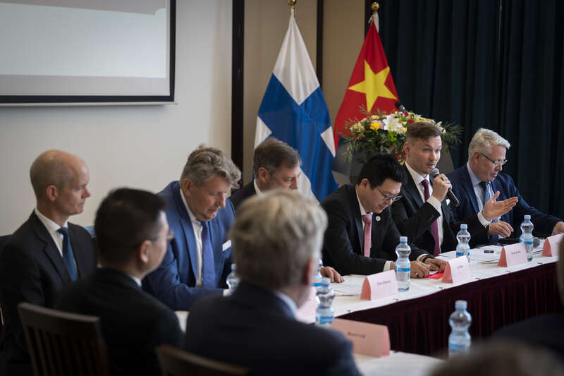 6月5日,芬兰通力集团副董事长尤西·赫林(右二)在芬兰赫尔辛基举办的以“回顾中芬互利合作70年,携手面向未来”为主题的研讨与庆祝活动现场发言。为纪念中芬政府间贸易协定签署70周年,中国驻芬兰使馆5日以“回顾中芬互利合作70年,携手面向未来”为主题举办研讨和庆祝活动。芬兰多位政商界人士在活动上强调,中国市场重要性不容忽视,将致力于拓展对华合作。1953年,中国和芬兰签订政府间贸易和支付协定,这是中国与西方国家签订的第一个政府间贸易协定。新华社发(马蒂·马蒂凯宁/摄)