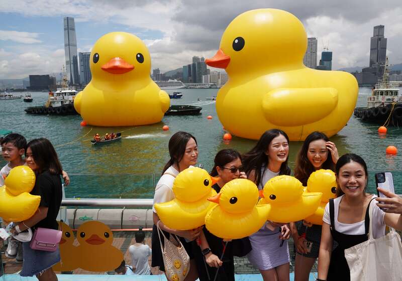 6月9日,在香港维多利亚港,人们在“大黄鸭”旁打卡留念。当日,两只高约18米的“大黄鸭”亮相香港维多利亚港。这是阔别10年后,“大黄鸭”再度到港。据悉,两只“大黄鸭”将于6月10日面向公众开放,展期约两周。新华社记者 王申/摄