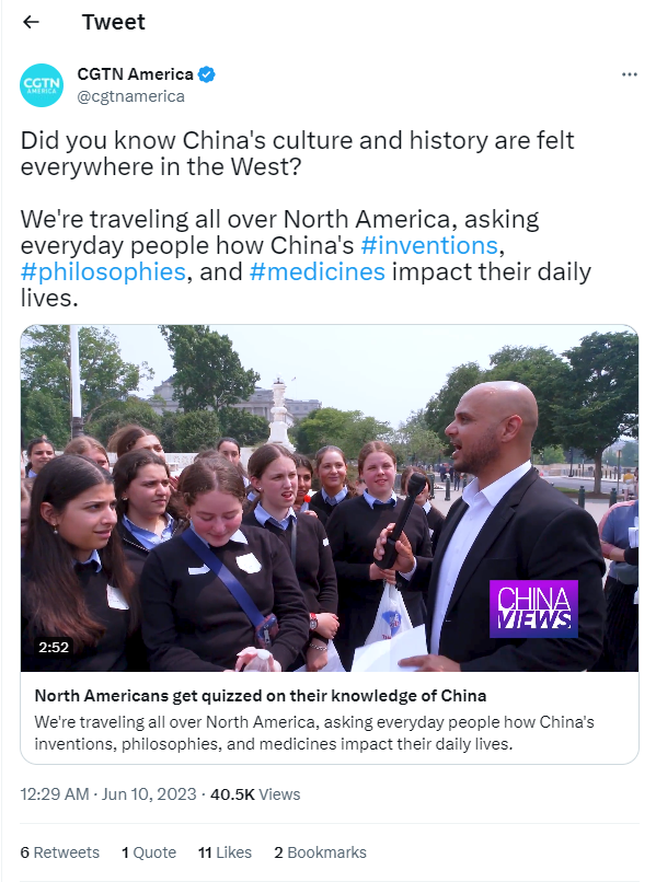 本次大型联合街采于当地时间6月9日在CGTN客户端、CGTN America推特、脸书、优兔等海外社交媒体平台同步推出,境内外平台浏览量迅速攀升至超过45万,触达1040万海外受众,并被美国《华盛顿日报》《加拿大内幕》网站、美国《斯坦利新闻报》等160家媒体转载。