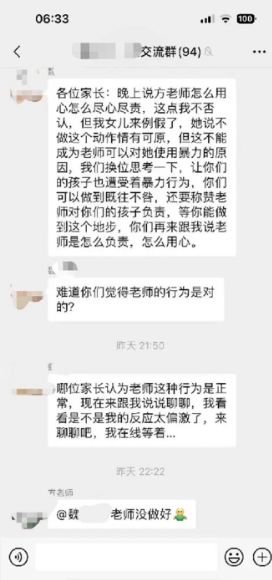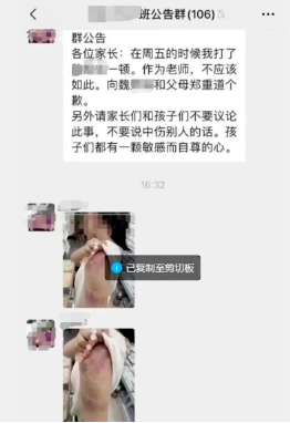 相关图片显示,这名女生被打后胳膊受伤颇为严重,皮肤已经变色。在该老师发出道歉声明之后,连续有三名学生家长在群里发言,对老师表示感谢和感恩之情,称其是一位“尽心尽责的好老师”。