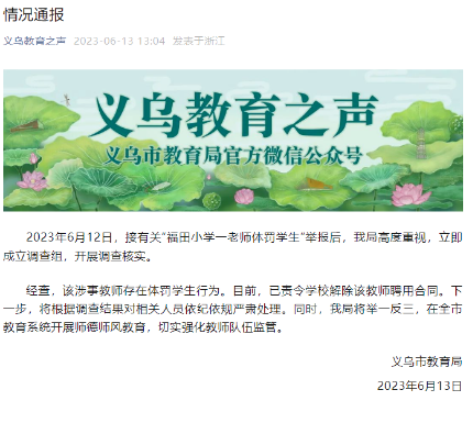 6月13日中午,浙江省义乌市教育局发布《情况通报》: