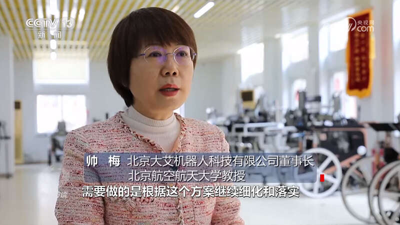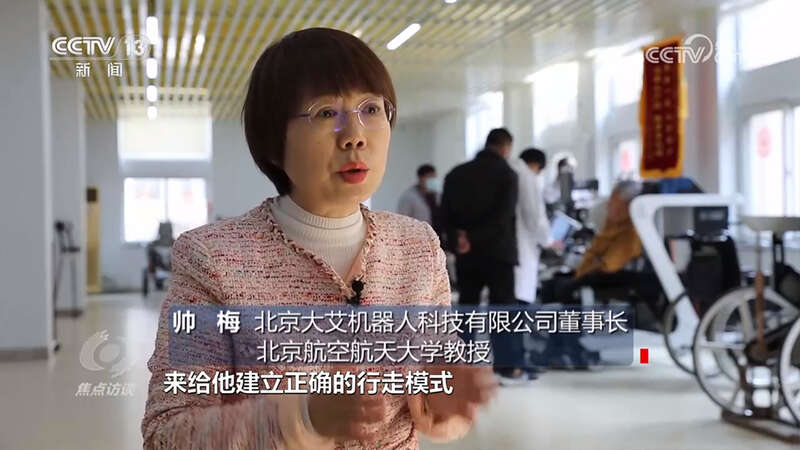 北京大艾机器人科技有限公司董事长、北京航空航天大学教授帅梅:“就是通过外骨骼机器人训练,来给他建立正确的行走模式,以及正确的本体感觉,让他能重新行走。”
