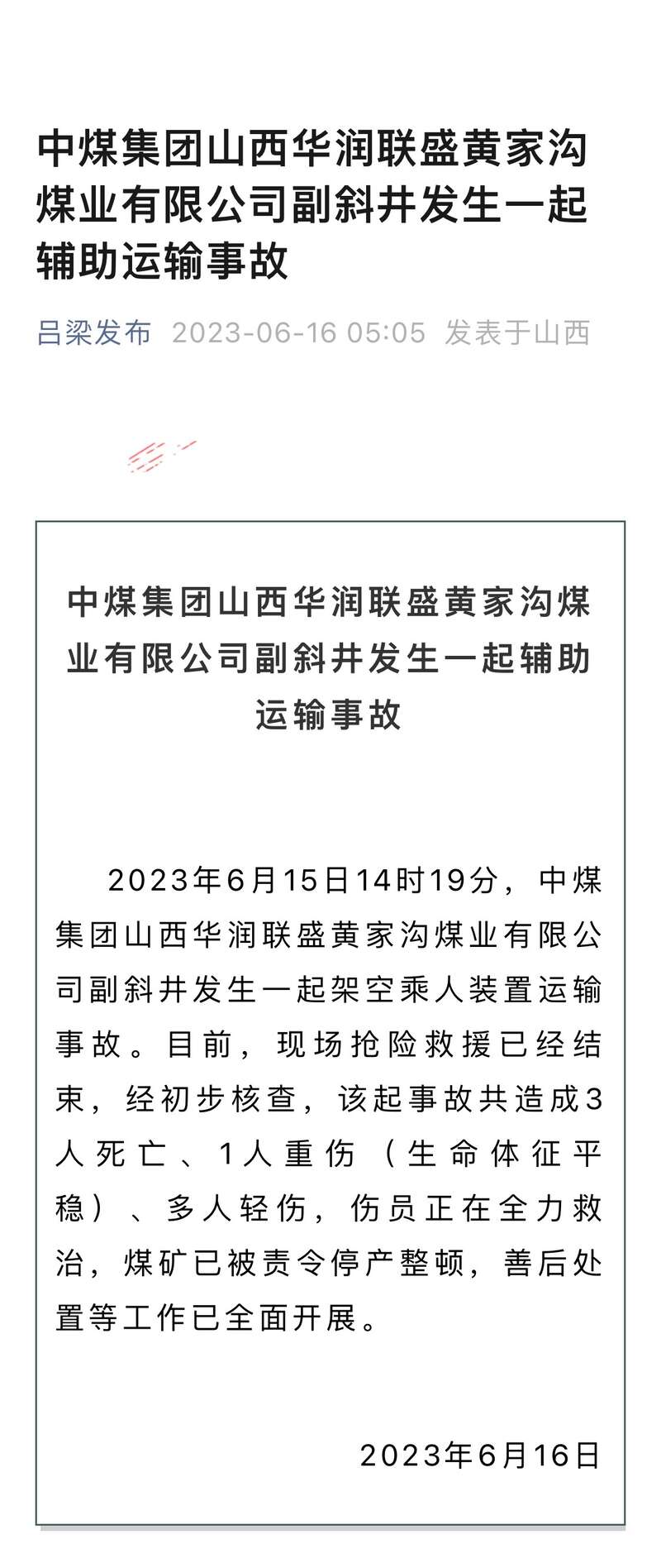 记者从吕梁市相关部门了解到,2023年6月15日14时19分,中煤集团山西华润联盛黄家沟煤业有限公司副斜井发生一起架空乘人装置运输事故。目前,现场抢险救援已经结束,经初步核查,该起事故共造成3人死亡、1人重伤(生命体征平稳)、多人轻伤,伤员正在全力救治,煤矿已被责令停产整顿,善后处置等工作已全面开展。