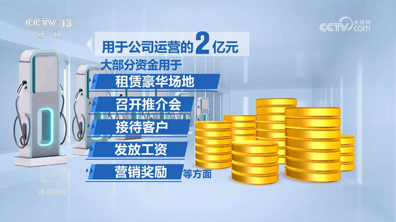 用于公司运营的2亿元,大部分资金用于租赁豪华场地、召开推介会、接待客户、发放工资、营销奖励等方面。实际仅修建充电桩123个,用资仅1000多万元,仅占资金总额的1%。