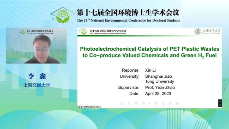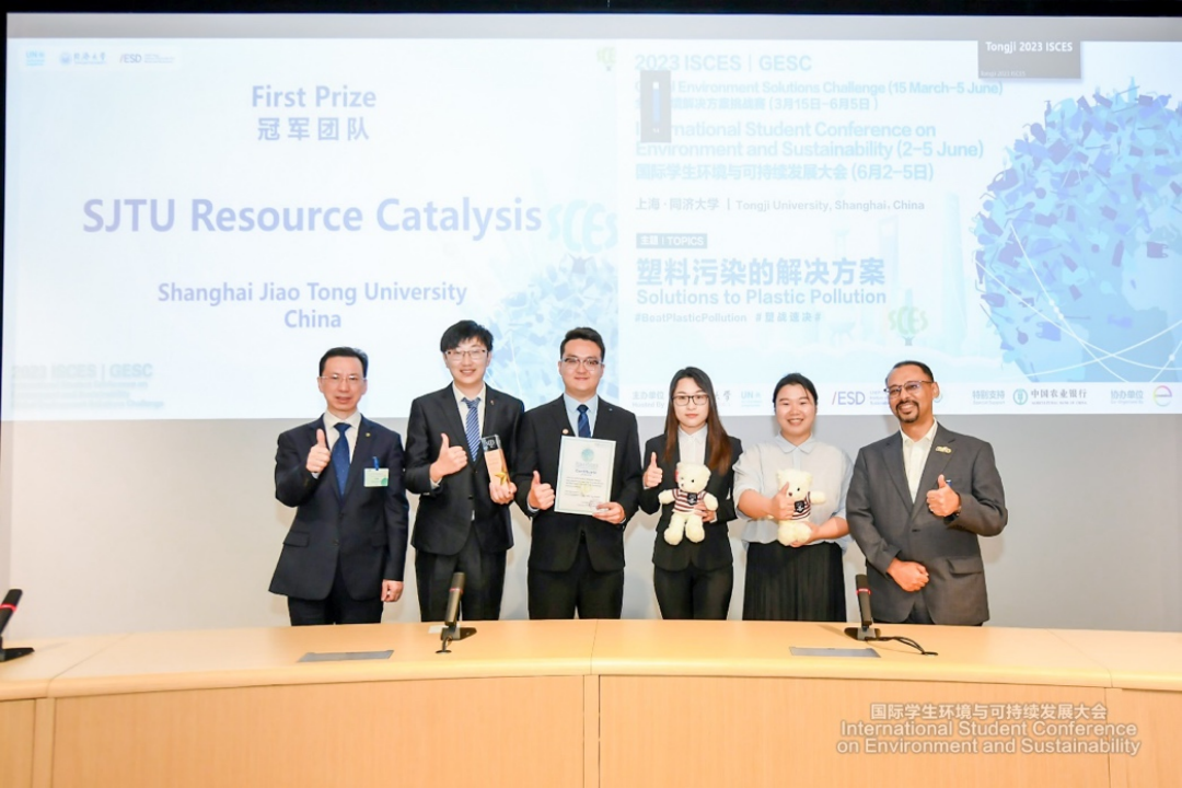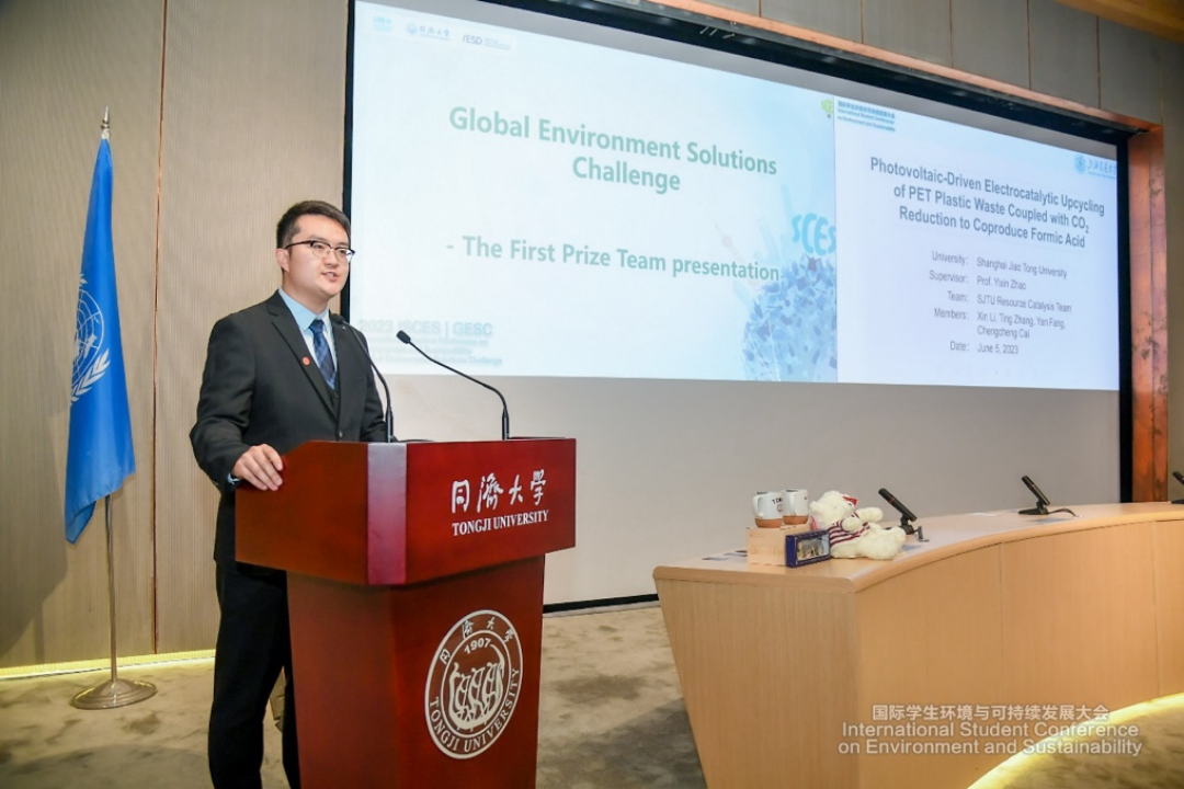 2023年6月5日,国际学生环境与可持续发展大会(ISCES)暨2023全球环境解决方案挑战赛颁奖仪式在同济大学召开,由上海交通大学环境科学与工程学院特聘教授赵一新指导,2018级“致远荣誉计划”博士生李鑫带队,2019级“致远荣誉计划”博士生方妍、2019级博士生张婷和2022级博士生蔡诚诚共同参与的研究项目《Photovoltaic-Driven Electrocatalytic Upcycling of PET Plastic Waste Coupled with CO2 Reduction to Coproduce Formic Acid》在来自全球28个国家和地区的125个团队、476名参赛选手中脱颖而出,斩获冠军。 李鑫及团队受邀出席第十二届国际学生环境与可持续发展大会,并在会上作为中国代表向全球展示塑料污染治理的中国方案和中国智慧。