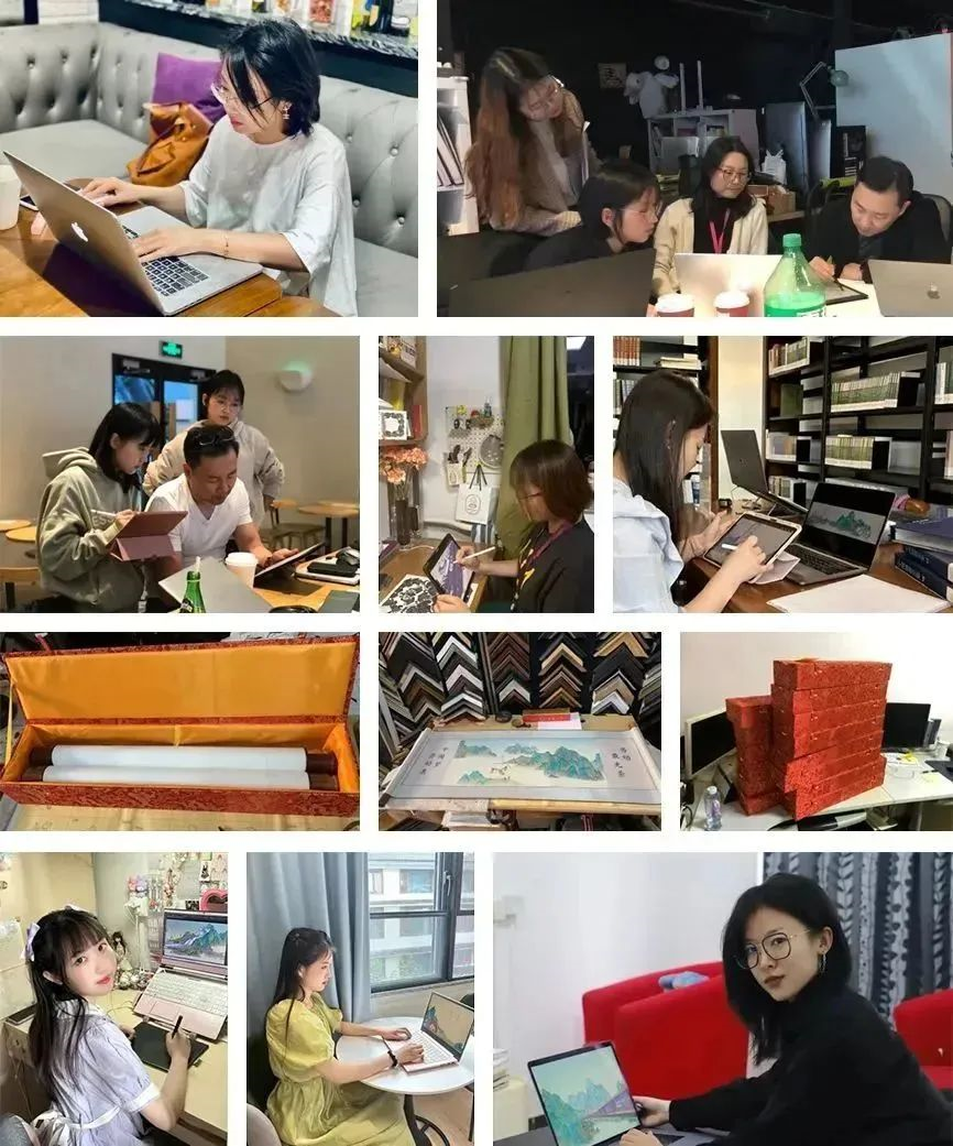 拍摄环节档期安排,让设计团队本就时间紧任务重的情况,又增加了几乎翻倍的工作量。但即使如此,团队在创作上也不容半点糊弄。“不能直接截取长卷的一部分作为小卷。”范寅良指着屏幕认真地为学生们讲解着:“考虑到小卷的画幅比例,咱们小卷的空间关系都需要有针对性地再调整。”经过加班加点的通宵辛劳,17副制作精美的小卷如期交付。