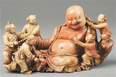 于阗采玉图玉山子、寿山嵌宝石五子闹佛等玉石雕艺术品体现了清乾隆时期巧夺天工的雕刻技艺。五子闹佛用一整块寿山石雕刻而成,弥勒佛屈膝斜坐,大耳垂肩,袒胸露腹,5个童子在他身旁嬉戏,发式不同、姿态各异,他被童子们闹得挤眉笑眼。弥勒衣纹流畅自然,沿胸衣襟上嵌有9粒红绿宝石。此器雕琢极为细腻,人物栩栩如生,构图也十分精巧。