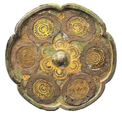 唐代金银平脱宝相纹葵花铜镜也是国家一级文物。此镜1971年出土于济南市解放路一座唐墓中,出土时已断为3块,后修复完整。此镜直径19厘米,六出葵花形,圆钮,钮周围饰六出重瓣形金片,其外为6个心状纹银片中套宝相花纹金片。心状纹间缀瓣纹金片,现存5枚。
