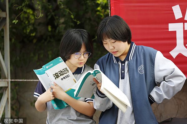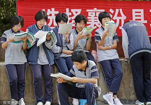 2023年6月20日,山西临汾,在襄汾县高级中学考点外,参加中考的学生在复习备考。