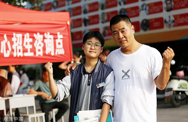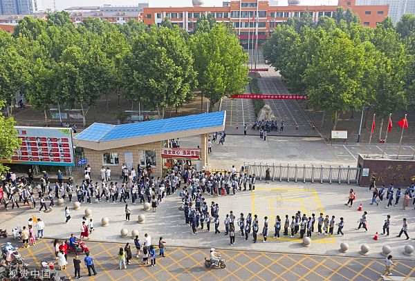 2023年6月20日,山西临汾,襄汾县高级中学考点外,参加中考的学生和家长一起加油鼓劲。