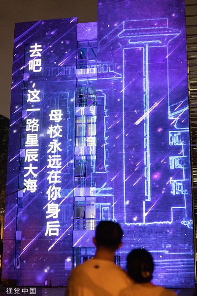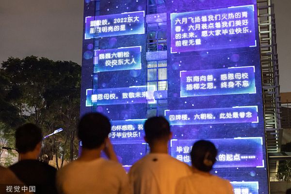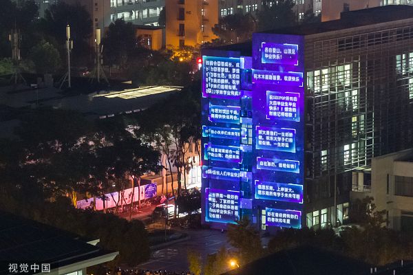 2023年6月19日,南京,东南大学毕业季“夜空中最亮的星”3D星空投影秀在该校九龙湖校区如期上演,该校10787名2023届毕业生(本科生与研究生)的名字和临别赠言被投影上墙,学校以此表达对毕业生的祝福。图为楼宇上投影出毕业生送给自己、同学和母校的临别赠言。 中新社记者 泱波 摄