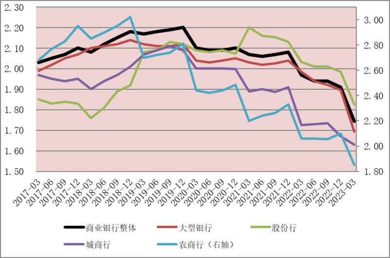 国家金融监督管理总局发布的数据显示,2022年商业银行净息差呈逐季下降之势,年末净息差为1.91%,同比下降17个基点,而2023年一季度净息差仅为1.74%,较2022年四季度下降0.17个百分点,再创历史新低。