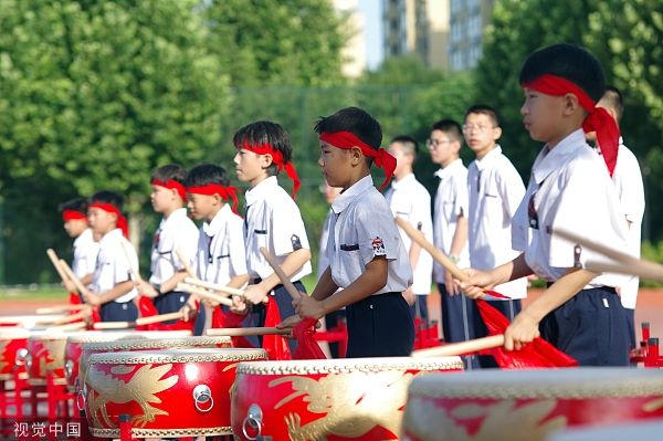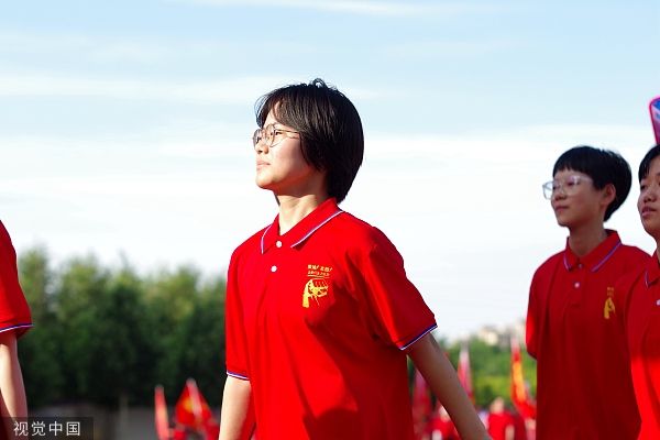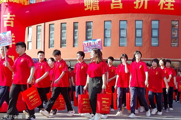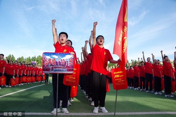2023年6月21日,河北邯郸,鸡泽县韶泽中学,考生参加送考仪式。河北省2023年中考当日开考。