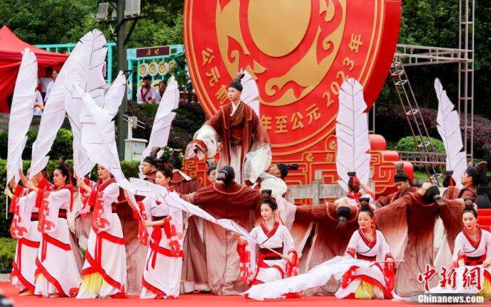 2023年6月21日,“中国端午 诗意宜昌”2023屈原故里端午文化节在湖北省宜昌市秭归县屈原故里文化旅游区盛大开幕。图为开幕式上文艺表演舞蹈《屈原》。张畅 摄