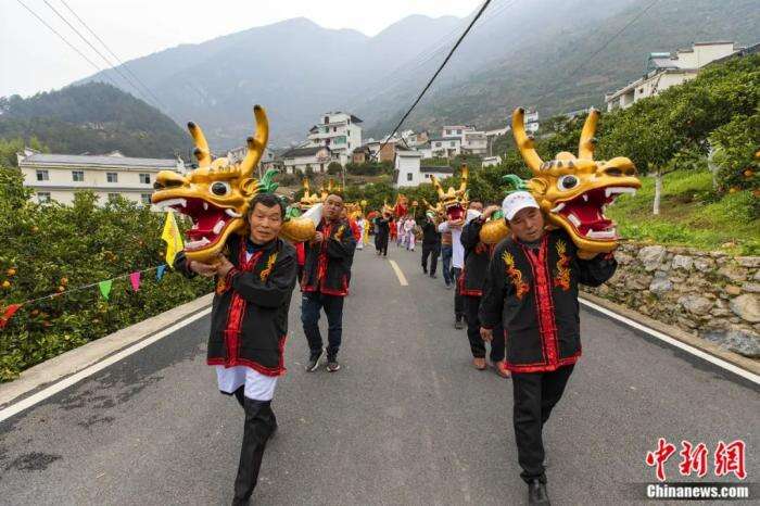 2022年3月4日,在秭归县归州镇万古寺村,当地村民抬龙头下水。聂爽 摄