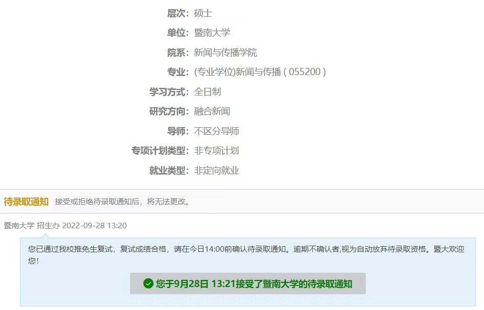 (暨南大学录取截图)