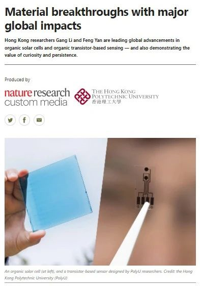 李刚教授与严锋教授曾入选科睿唯安2022年度全球“高被引科学家”名单(Highly Cited Researchers 2022)。在Nature Portfolio的访谈中,两位教授分享了他们在先进材料领域的科研突破,包括有机太阳能电池、钙钛矿(perovskites)、有机晶体管感测(organic transistor-based sensors)等——一直以来,理大科研人员不断通过卓越创新为全球科研发展带来积极影响、以科学精神为社会发展做出积极贡献。