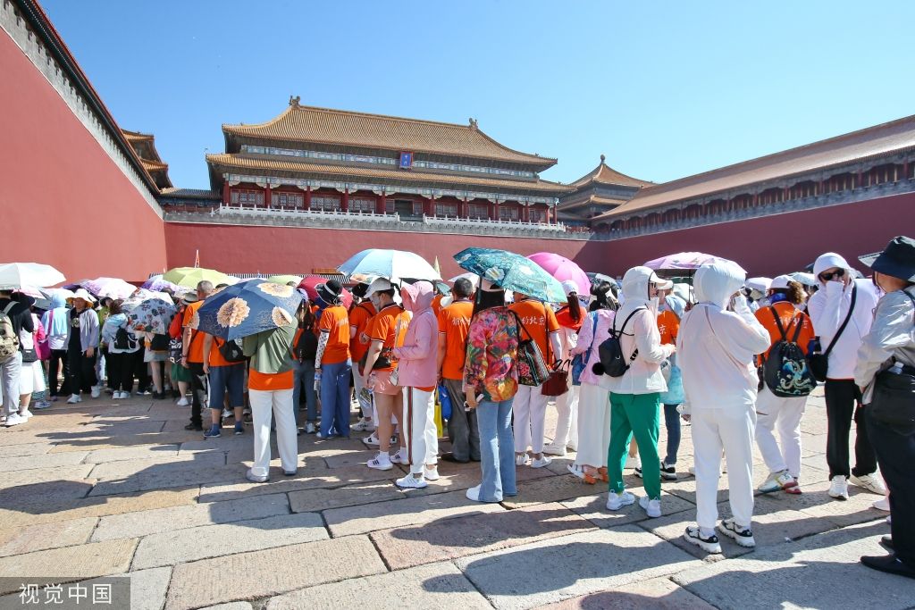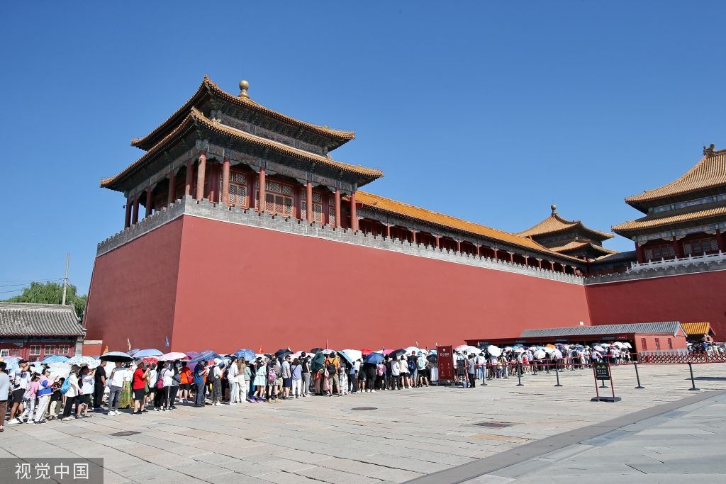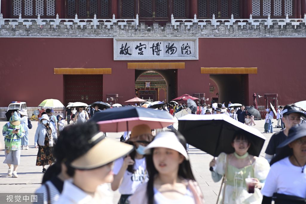 2023年6月22日,北京故宫博物院游客撑伞、戴遮阳帽防晒。当日,北京南郊观象台录得今年首个40℃以上高温。据悉,上一次北京出现40℃以上的高温还是2014年5月29日。 中新社记者 田雨昊 摄